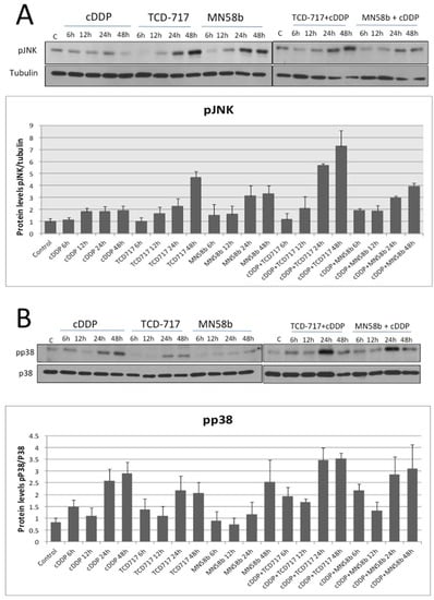 The cells were incubated with ChoKα inhibitors and cisplatin alone or in combination. Equal amounts of protein (30 μg) were loaded into 15% SDS-PAGE acrylamide gels, and the resolved proteins were transferred onto nitrocellulose membranes. The following antibodies were used: anti-p-JNK (Promega, v7932), anti-p-p38 (Cell Signaling 9211S), and anti-P38 (Santa Cruz sc-535), with anti-α-tubulin (Sigma T9026) as a load control.