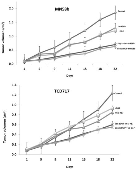 With this combination therapy, no external signs of toxicity were observed during the treatment, as indicated by the maintenance of body weight. The concomitant treatment of MN58b reached the same efficacy as that of the sequential group, but much higher doses of cytotoxic agents were required. By contrast, to obtain similar effectiveness in the inhibition of tumor growth (65%) using cisplatin as a single agent, its dosage had to be increased from 1 to 4 mg/kg, conditions in which clear signs of toxicity were observed, including a significant reduction in body weight (Table 3). Similar results were obtained when the RSM-932A/TCD-717 inhibitor was used (Table 3).