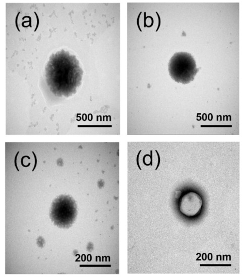 TEM micrographs of FOS-loaded Span® 60-niosomes (a) Sp-SC24; (b) Sp-DCP; (c) Sp-SC24+γCD and (d) Sp-DCP+γCD.