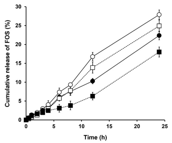 According to our knowledge base, few studies have reported CD inclusion complex in niosome vesicles [47,55,56,57,58,59,60]. Our data results have shown that %EE of FOS increased when incorporating the FOS/γCD inclusion complex in niosomal preparations. This finding was similar to related reports [58,61]. The higher %EE in niosome containing γCD might have been because CD forms hydrogen bonds interacting with the polar head group of nonionic surfactants. The stronger the hydrogen binding intensity, the greater %EE was obtained [45,62]. Moreover, complexation of free CD with hydrophobic tails of surfactants creates a more internal aqueous space by decreasing membrane thickness [46,47]. However, all niosomal formulations have poor %EE of FOS (<40%). Remote loading method and changes to the formulation variables (i.e., surfactant/cholesterol ratio and their concentrations, buffer molarity and pH, hydration time, etc.) can be applied to optimize %EE. Due to the lower %EE of Brij® 76-niosomes (stabilized by SC24 and DCP) and the evidence of the particle aggregation with the lowest %EE among the groups in all niosomes using STA as stabilizer, these formulations were excluded from further studies.