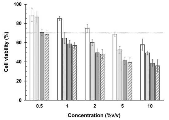 In vitro cytotoxicity test was determined using the methylthiazolyl-diphenyl-tetrazolium bromide (MTT) assay [27,28]. Briefly, the niosomal formulations containing FOS without and with γCD (Sp-DCP and Sp-DCP+γCD, respectively) including their respective blank samples, i.e., B-Sp-DCP and B-Sp-DCP+γCD were evaluated for their toxicity to the rabbit corneal fibroblasts, i.e., the SIRC (rabbit corneal cell line) cells (CCL-60; ATCC, Manassas, VA, USA). Each sample was diluted to the concentration of 0.5, 1, 2, 5 and 10% (v/v) of the test samples by a complete medium that contained Eagle’s Minimum Essential Medium and fetal bovine serum (FBS). FOS concentrations in the tested samples ranged from 0.005 to 0.1% w/v. The cells were cultured in the complete medium and maintained at 37 °C under 5% CO2 atmosphere. They were seeded in 96-well plates with a density of 1 × 105 cells/well/100 µL and incubated for 24 h. Thereafter, each test sample (100 µL) was added to the well. The cells were incubated for 24 h and washed twice with PBS (pH 7.4) at the end of incubation period. MTT solution in PBS (pH 7.4) was added to each well and incubated for 4 h. The formazan crystals were dissolved using 0.04 M HCl in isopropanol (100 µL/well). The optical density (OD) of each well was measured at 570 nm by a microplate reader (Fluostar Omega, BMG Labtech, Ortenberg, Germany). The experiments were performed in four replications, and cell viability (CV) was calculated following Equation (3). The test samples were considered to be toxic to the cells if the CV (%) was less than 70%.