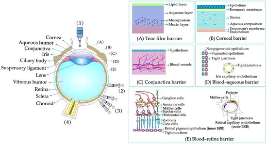 When the drug passes through the tear film and reaches its target site, it may encounter a variety of dynamic or static barriers present in tissues, such as the cornea barrier, conjunctiva barrier, blood–aqueous barrier, and blood–retina barrier (BRB) (Figure 1).