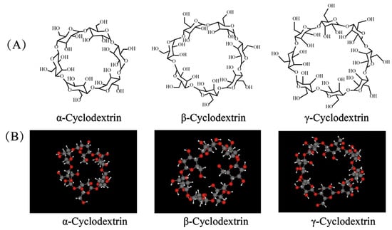 Structures of three common cyclodextrins: (A) planar structure; (B) 3D structure.
