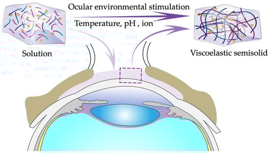 In situ gels consist of environmentally sensitive polymers that can rapidly transform a solution into a viscoelastic semisolid gel within the conjunctival sac in response to environmental stimuli such as pH, temperature, and ionic strength and finally slow release of a drug under physiological conditions (Figure 4) [68,69,70]. Environmental stimuli that affect in situ gels can be classified as biological, chemical, and physical stimuli. Biological stimuli include changes in glucose levels and enzyme activity; chemical stimuli involve changes in pH and ionic strength in biological fluids [71]; and physical stimuli include changes in temperature, sound, electric fields, pressure, light, and magnetic fields [72,73,74]. As a novel drug delivery system, in situ gels eye drops have many formulation advantages: (1) ease of use, accurate drug delivery, and good reproducibility; (2) prolonged retention of the drug at the desired site, reducing frequent administration; (3) simple production process and easy scalability to industrial frameworks; (4) the ability to deliver sensitive drugs [75]; and (5) good tolerability [76]. The most studied in situ gels are temperature-sensitive, pH-sensitive, and ion-sensitive in situ gels.
