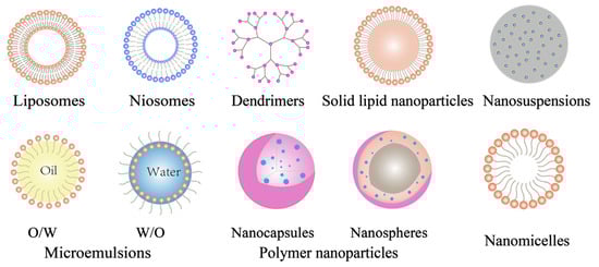 Nanoparticles (typically 10–1000 nm in size) can deliver drugs to the posterior segment of the eye by passive or active (ligand-mediated) targeting [107]. Nanoparticles can promote drug penetration into the ocular layer, prolong the residence time of eye drops and reduce toxicity. In recent years, many nanoparticles have begun replacing invasive and surgical interventions in the treatment of many diseases of the posterior segment of the eye that cause visual impairment and even blindness. The nanoparticles for targeting the posterior segment of the eye mainly include liposomes, niosomes, dendrimers, solid lipid nanoparticles, nanosuspensions, microemulsions, polymer nanoparticles, and nanomicelles (Figure 5) [108].