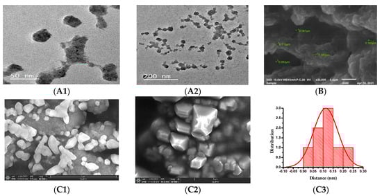 TEM image (A1,A2) and SEM image (B) of the encapsulated apigenin (Ap-CH-BSA-FANPs). SEM Image of Free Capsules (C1), SEM image of Ap-CH-BSA-FANPs (C2), Quantification analysis of diameter of pores in Ap-CH-BSA-FANPs (C3).