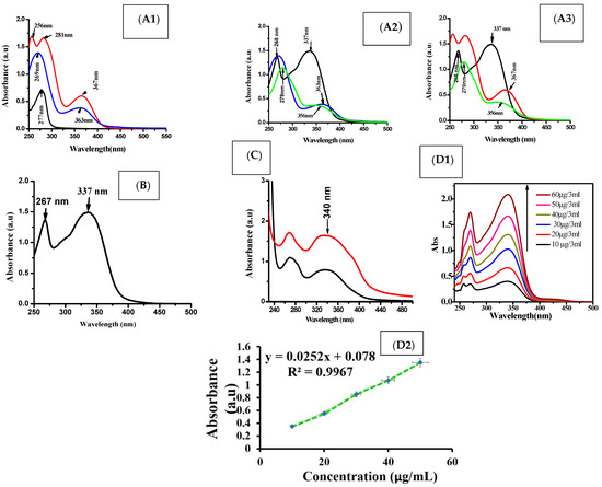 UV spectra for folic acid (red color), albumin (black color), free capsule (blue color), encapsulated apigenin (green color) (A1–A3) and apigenin (black color) (B). Standard curve for different apigenin concentrations (D1,D2) and the loading capacity of apigenin concentration after encapsulation (C).