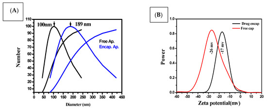 The prepared nanoparticles were characterized on the basis of particle size, size distribution, and zeta potential. The mean particle size of the free capsule was 100 nm with a PDI of 0.1 ± 0.004, while encapsulation of Ap exhibited a mean particle size of 189 nm and a PDI of 0.3 ± 0.2. Low PDI values indicate that the formulations exhibit even-sized particles (Figure 3A). The mean zeta potential values of the free capsule and Ap-CH-BSA-FANPs, as determined by the DLS technique, were found to be −26 and −17 mV, respectively. The zeta potential of −17.0 mV was within the recommended range (−30 mV to +30 mV), indicating that encapsulated apigenin (Ap-CH-BSA-FANPs) would not quickly settle and would be suspended and distributed in the physiological media and could be injected intravenously [49]. The negative zeta potential also favors reticuloendothelial system (RES) uptake by the liver and spleen [17] (Figure 3B).