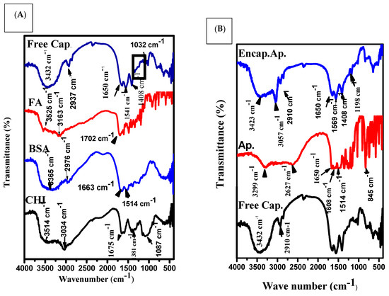 The FTIR of the Ap-CH-BSA-FANPs spectrum showed bands at 3423 and 3057 cm−1 that were associated with O-H and N-H starching vibration. The band located at 2910 cm−1 was assigned to the pterin ring structure of FA (Figure 4B).