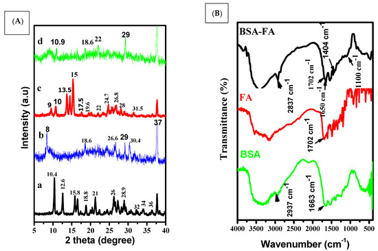 (A) XRD graphs of (a) folic acid, (b) free capsules, (c) pure apigenin, (d) encapsulated apigenin. (B) FTIR of BSA, FA, and BSA-FA.