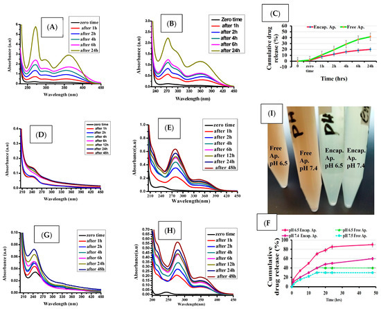 UV visible of pure apigenin (A) and encapsulated apigenin (B). In vitro release profile of encapsulated apigenin (green color) and pure apigenin (red color) (C). Pure apigenin in pH 6.5 (D). Encapsulated Apigenin in pH 6.5 (E). Photomicrograph for solubility of apigenin in pH 6.5 and pH 7.4 (F). Pure apigenin in pH 7.4 (G). Encapsulated apigenin in pH 7.4 (H). In vitro release profile of apigenin in pH 6.5 and pH 7.4 (I).