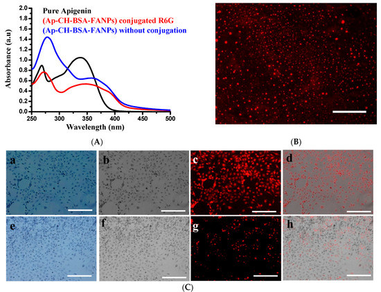 The targeting capacity of Ap-CH-BSA-FANPs internalized inside HePG2 cells was measured by fluorescence microscopy. R6G labeled Ap-CH-BSA-FANPs (Figure 7A,B) were successfully localized inside the cytoplasm, as demonstrated by the intensity of fluorescence emission of red color located in the perinuclear region compared to Ap-CH-BSA-NPs without FA (Figure 7C).
