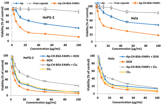 Mean viability of HePG-2 and Hela cell lines after treatment with apigenin, free capsules, Ap-CH-BSA-FANPs, Ap-CH-BSA-FANPs + DOX, Ap-CH-BSA-FANPs + Cis, DOX, and Cis.