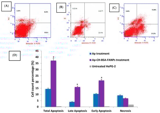 The apoptotic, necrotic percentage in HePG-2 cell treated with Ap (B) Ap-CH-BSA-FANPs (C) compared with the untreated cells (A). Bar plots (D) represent early, late, and total apoptosis. * p < 0.05 significant compared with the apigenin treatment.