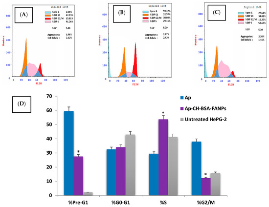 As illustrated in Figure 9B,C, the percentage of apoptotic death mode (early and late apoptosis) in the HePG-2 cells tresated with the IC50s of the Ap or Ap-CH-BSA-FANPs were 14.41% and 37.81%, respectively. So, the apoptotic percentage of HePG-2 cells treated with Ap-CH-BSA-FANPs was significantly increased than its percentage in Ap treatment (p = 0.001). These results suggested the high ability of chitosan to deliver the Ap into the cancer cells compared to the free Ap (Figure 9D). No significant change was observed in the necrotic phase between the Ap and the Ap-CH-BSA-FANPs. These data proved the mode of action of encapsulated apigenin was mostly via apoptosis, not necrosis, and when loading the Ap on the chitosan and coating it with BSA conjugated with folic acid, it increased the anticancer activity via enhancing its apoptotic action. Our results also agreed with recent studies revealing that loading of apigenin on liposome and PLGA could enhance its anticancer effect via inducing apoptosis [20,58]. In order to confirm that mode of action, the cell cycle was determined on the HePG-2 cells treated with Ap or Ap-CH-BSA-FANPs.