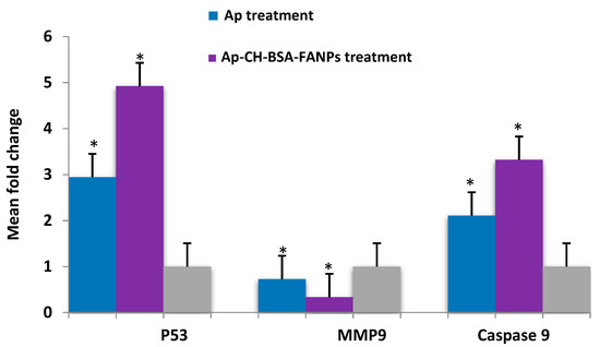 Total RNA was extracted from the untreated/treated HePG-2 cells with the IC50 of Ap or Ap-CH-BSA-FANPs using Qiagen RNA extraction/BioRad SYBR green PCR MMX according to the manufacturer’s instructions. The Rotorgene RT-PCR system was used to assess the concentration of isolated RNA. The p53 primers used were (F 5′-ATGTTTTGCCAACTGGCCAAG-3′, R 5′-TGAGCAGCGCTCATGGTG-3′, Casp9 primers were (F 5′-CATTTCATGGTGGAGGTGAAG-3′, R 5′-GGGAACTGCAGGTGGCTG-3′) and the MMP9 primers were (F 5′-CCA CGG TGC GGG GTC CCA GAC-3′, R 5′-GGA GAC GCC CAT TTC GAC GA-3′. The β-actin primers were (F 5′-GTGACATCCACACCCAGAGG-3′, R 5′-ACAGGATGTCAAAACTGCCC-3′).