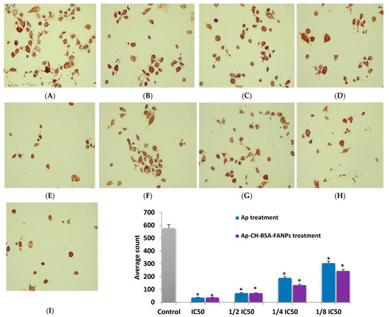 HePG-2 cells were treated with Ap or Ap-CH-BSA-FANPs for 48 h. Cells were then collected and centrifuged for 10 min at 1700 rpm in cooling centrifuges. The supernatant was properly aspirated, and the cell pellets were washed three times with sterile PBS. A volume of 50 µL of treated/untreated cells was properly aspirated into clean, positively charged glass slides before being stored in the refrigerator overnight. All of the slides were fixed with methanol for 30 min. After fixation, the slides were incubated for one hour at 24 °C with a primary anti- Bcl-2 antibody (R & D Systems Inc., MAB827, Minneapolis, MN, USA). The slides were then immersed three times in PBS, incubated for 30 min at room temperature with anti-mouse IgG secondary antibody (EnVision + System HRP; Dako, Agilent, Santa Clara, CA, USA) visualized with diaminobenzidine commercial kits (Liquid DAB + Substrate Chromogen System; Dako), and counterstained with Mayer’s hematoxylin. Finally, a light microscope was used to examine the slides. The number of positive cells in a total of 1000 counted cells in at least 10 high power fields was used to calculate the Bcl-2 protein.