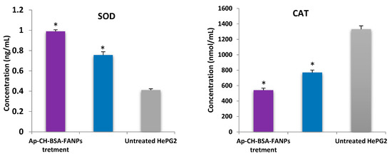 The activities of catalase (CAT) and superoxide dismutase (SOD) enzymes of untreated/treated HePG-2 cells were assessed by using the Abcam colorimetric kit (ab83464) and the Cloud-Clone Corp (Enzyme-linked Immunosorbent Assay) Kit. The tested enzymes were determined according to the manufacturer’s protocol.