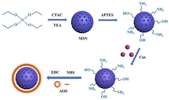 Preparation of MSN-NH2-Cur-AOS nanoparticles.