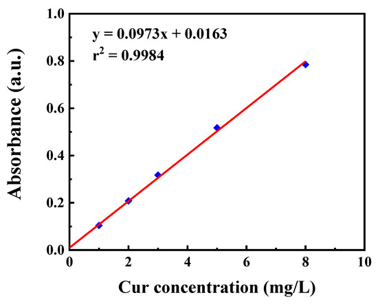 Encapsulation efficiency (EE) and loading efficiency (LE) are important indicators of the quality of nanomedicines, which respectively represent the efficacy of encapsulation and loading. Following the preparation of MSN-NH2-Cur-AOS, the supernatant was collected by centrifuging the nanoparticle samples (8000 r/min, 15 min). The mass of Cur initially added was denoted by Wt. Wd denoted the free Cur content in the supernatant, and Wl denoted the dry mass of precipitate. The supernatant of MSN-NH2-AOS obtained by the same method was used as a reference. Stock solutions of Cur (200 mg/L) were diluted to obtain serial standard solutions to fit the standard curve (shown in Figure 2), and the content of Cur was determined using the standard curve equation and UV measurements at 426 nm. EE and LE of the drug were calculated according to the following formulas: