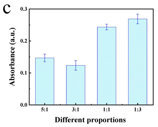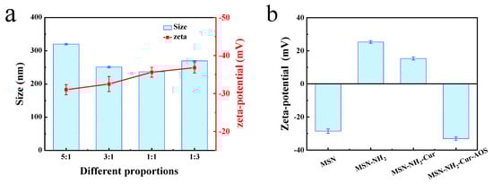 MSN-NH2 exists as a cation in an aqueous solution, but AOS is in the form of an anion in the aqueous solution. Therefore, when MSN-NH2 and AOS are mixed evenly by mechanical stirring, they self-organize into nanoparticles through electrostatic interaction [49]. The solution of MSN-NH2 at a low concentration is transparent, with almost no flocculation. However, the solution containing a high concentration of MSN-NH2 results in aggregation and an enormous amount of precipitation. Therefore, the effect of the MSN-NH2 to AOS ratio on the morphology of nanoparticles needs to be investigated. As seen in Figure 4a and Table 2, when the ratio of MSN-NH2 to AOS in the solution was 5:1, because of the relatively high MSN-NH2 ratio, the amount of free MSN-NH2 remaining in the solution was high, and the nanoparticles obtained had a large particle size and poor dispersion. This may be due to the aggregation of excess MSN-NH2 cations, which destroy the particle dispersion steady-state and result in particle aggregation and particle size increase [50]. When the MSN-NH2 content was decreased (5:1 to 1:1), the size of MSN-NH2 nanoparticles decreased significantly (p < 0.05), and MSN-NH2 particles combined with AOS reached the dispersion state at the same time due to the positive and negative charge attraction. However, when the ratio of the two compounds was adjusted from 1:1 to 1:3, the particle increased in size from 236.80 ± 0.54 nm to 269.50 ± 1.03 nm, indicating that more AOS remained in the nano-dispersion solution. Meanwhile, the surface potentials of nanoparticles, which were all negative, continuously decreased with the decrease of MSN-NH2 content, indicating that AOS had a dominant influence on the potential of nanoparticles [51]. In addition, the zeta potential changed during the preparation of MSN-NH2-Cur-AOS. As shown in Figure 4b, the zeta potential of MSN increased from −28.6 ± 1.3 mV to 25.3 ± 0.8 mV after the preparation of MSN-NH2 by amine functionalization. After loading Cur and coating with AOS, the zeta potential of MSN-NH2 decreased from 25.3 ± 0.8 mV (MSN-NH2) to 15.3 ± 0.9 mV (MSN-NH2-Cur) and −33.1 ± 1.1 mV (MSN-MH2-Cur-AOS). The variation of zeta potential indicated that the modification of MSN was successful. Figure 4c shows the absorbance of curcumin released by the nanocarrier after loading with 0.5 mg of Cur. The absorbance of Cur increased with the increasing AOS content. While the AOS ratio increased from 1:1 to 1:3, the rising trend of the absorbance of Cur was slow. On this basis of these data, we selected the 1:1 ratio for subsequent experiments.