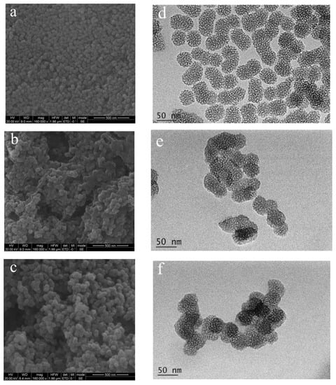 SEM images of MSN-NH2 (a), MSN-NH2-AOS (b), and MSN-NH2-Cur-AOS (c). TEM images of MSN-NH2 (d), MSN-NH2-AOS (e), and MSN-NH2-Cur-AOS (f).