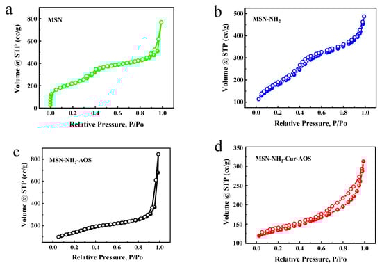 N2-adsorption and desorption curves for MSN (a), MSN-NH2 (b), MSN-NH2-AOS (c), and MSN-NH2-Cur-AOS (d).