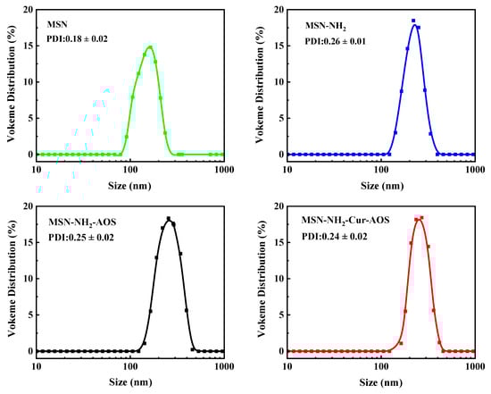 The dimensions of MSN, MSN-NH2, MSN-NH2-AOS, and MSN-NH2-Cur-AOS nanoparticles were analyzed and measured using DLS [53,54]. Figure 7 shows the average particle size of MSN and MSN-NH2 was about 158 nm (PDI = 0.18 ± 0.02) and 227 nm (PDI = 0.26 ± 0.01), respectively, indicating the successful introduction of -NH2. The average particle size of MSN-NH2-AOS increased to 310 nm (PDI = 0.25 ± 0.02) when coated with AOS. It can be observed that Cur entering MSN pores had little effect on the particle size of the nanocarriers. Compared with MSN-NH2 nanoparticles, MSN-NH2-AOS and MSN-NH2-Cur-AOS nanoparticles had larger average sizes and wider size distributions, and there was little difference in size between the two nanoparticles. The above results demonstrated the successful preparation of MSN-NH2-Cur-AOS, the successful entry of Cur into MSN-NH2 mesopore, and the encapsulation by AOS mainly in MSN-NH2.