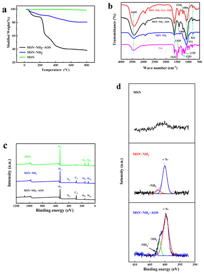 Figure 8a shows the TGA curves of MSN, MSN-NH2, and MSN-NH2-AOS nanoparticles. The weights of the three kinds of nanoparticles were similar at more than 80% of the temperature range of 30–200 °C. In the test range from 30 to 800 °C, the weight loss of MSN alone was only 1.5%. Before 100 °C, the main loss was the binding water on the surface of MSN nanoparticles, which may be due to the dense mesopore structure of MSN. MSN-NH2 had a mass loss in the temperature range of about 20 to 100 °C and 400 to 630 °C, which was caused by the thermal decomposition of the grafted organic matter APTES and a large amount of combined hydrothermal volatilization, proving the success of grafting. In addition, the weight loss of MSN-NH2-AOS between 20–100 °C was caused by surface water separation, and the weight decreased significantly between 200–400 °C, which was related to the thermal degradation of the coated AOS and was the result of the breakage of glucoside bonds and the de-composition of glycosyl units of AOS. The weight loss between 400 °C and 630 °C also indicated that NH2 graft modification was successful, and the total weight loss was 61.81%. These results showed that each modification step was successfully carried out, and the MSN-NH2-AOS carrier was successfully prepared for Cur encapsulation.