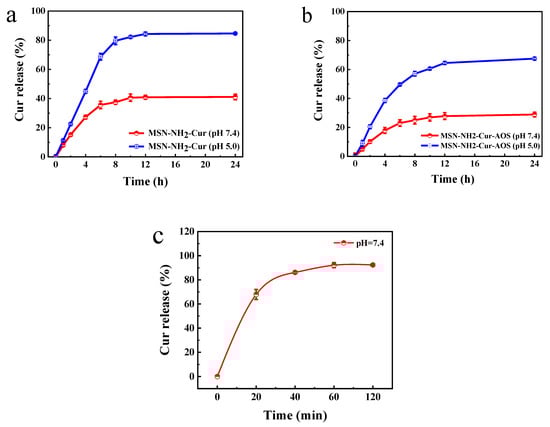 Release rates of Cur from MSN-NH2-Cur nanoparticles (a) and MSN-NH2-Cur-AOS nanoparticles (b) under different pH conditions within 24 h. Release rates of curcumin at pH = 7.4 (c).