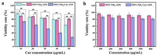 According to literature reports, Cur is safe for normal cells [24,35]. Therefore, we studied the cytotoxicity of the nanoparticles in HCT-116 colon carcinoma cells and the cytotoxicity of MSN-NH2-AOS and MSN-NH2-Cur-AOS in L929 fibroblast cells using the MTT assay. Figure 10a shows the viability rate of HCT-116 cells after 24 h treatment with Cur, MSN-NH2-AOS, and MSN-NH2-Cur-AOS nanoparticles. The survival rates of HCT-116 cells treated for 24 h in Cur, MSN-NH2-AOS, and MSN-NH2-Cur-AOS change in a dose-dependent manner [67,68]. The cell survival rate decreased more slowly compared to the other groups when the cells were treated with free Cur. When the concentration of Cur reached 50.0 µg/mL, more than half of the tumor cells were still viable, with a cell survival rate of 62.76%. This effect was mainly because free Cur does not rely on endocytosis and can only enter the cells by penetrating the cell membrane. When the cells were treated with MSN-NH2-AOS at a dose substituting for that of MSN-NH2-Cur-AOS carrying 50.0 µg/mL of Cur, the cell survival rate was over 80% and the rate of apoptosis was not significant. The survival rate of cells treated with MSN-NH2-AOS was significantly greater than that of those treated with free Cur and MSN-NH2-Cur-AOS carrying an equal amount of Cur. At this point, the blank carrier obstructs tumor growth and respiration, which is the major cause of cell apoptosis [69]. Meanwhile, Figure 10b shows that when L929 cells were treated with MSN-NH2-AOS at concentrations of 100, 200, 300, 400, 500, and 800 µg/mL, cell viability exceeded 90%. When the L929 cells were treated with the same concentrations as MSN-NH2-Cur-AOS, the cell survival rate was greater than 80%. These results imply that the MSN-NH2-AOS carrier itself has no cytotoxicity and is relatively safe. Among the experimental groups shown in Figure 10a, the survival rate of the cells treated with MSN-NH2-Cur-AOS was significantly lower than that of the other two groups (p < 0.01). When the concentration of Cur reached 50.0 µg/mL, the cell survival rate decreased to 27.48%, indicating an increase in cell death in a dose-dependent manner. This shows that the damage to tumor cells mainly resulted from Cur released by MSN-NH2-Cur-AOS, and MSN-NH2-AOS is a suitable Cur carrier, with no cytotoxicity against tumor cells.
