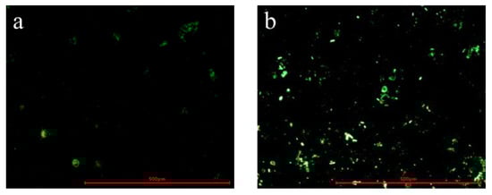 Fluorescence images of cells treated with MSN-NH2-Coumarin-6-AOS for 30 min (a) and 1 h (b).