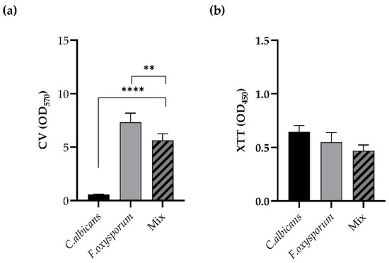 Panel (a): Comparison between the total biomass of monospecies biofilms of C. albicans and F. oxysporum with the dual-species biofilms formed by C. albicans/F. oxysporum starting from a ratio of 1:1. Panel (b): Comparison between the metabolic activities of monospecies biofilms of C. albicans and F. oxysporum and the dual-species C. albicans/F. oxysporum biofilm formed starting from a ratio of 1:1. Statistical significance: ** p < 0.01; **** p < 0.0001 (Tukey’s test).