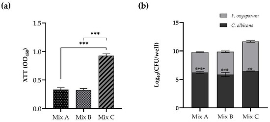 Panel (a). Metabolic activity of mixed biofilm. F. oxysporum inocula were dispensed, as first colonizer, allowing adherence (4 h, Mix A), formation (24 h, Mix B), and maturation (48 h, Mix C) before C. albicans addition h. Panel (b). Competitive behavior during formation of mixed biofilm. Log of colony-forming units (CFU) per well isolated from dual-species biofilms formed in the three different conditions of Mix A, Mix B, and MixC. Significant differences were determined by Tukey’s test, ** p < 0.01; *** p < 0.001, **** p < 0.0001.