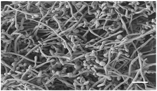 SEM image of the dual-species biofilm of F. oxysporum and C. albicans. Bar corresponds to 10 μm.