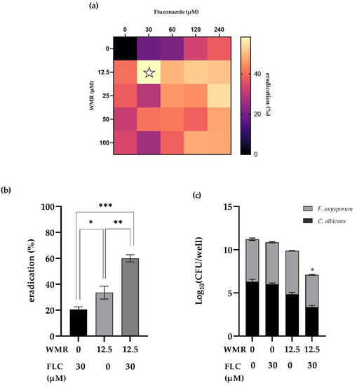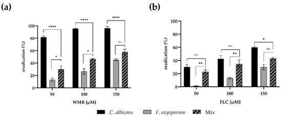 The minimal concentrations of WMR and FLC that eradicate mono- and dual-species pre-formed biofilms were monitored. As shown in Figure 4, the application of either WMR or FLC alone was not sufficient to completely eradicate mono- and dual-species biofilms of F. oxysporum within the concentration ranges tested, reaching 40% eradication at 150 μM concentration. On the contrary, we confirmed the good performance of WMR (Figure 4a) on C. albicans biofilm eradication.