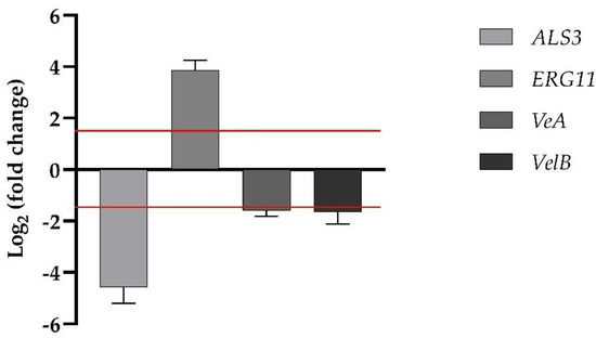 Transcriptional analysis of one of the ergosterol synthesis genes, ERG11, and one of the adhesin genes, ALS3, for C. albicans were investigated by qRT-PCR, as summarized in Figure 6. The expression levels of the two genes showed a differential behavior upon treatment of WMR/FLC. ERG11 was moderately upregulated, whereas ALS3 was significantly downregulated. VeA and VelB belong to the genes of the velvet regulation system, influencing the growth and development of the hypha, and conidiation as well as relations with the secondary metabolism for F. oxysporum, respectively. As expected, both VeA and VelB genes in the presence of WMR/FLC in synergistic combination were downregulated (1.59-fold, and 1.65-fold, respectively) (Figure 6).