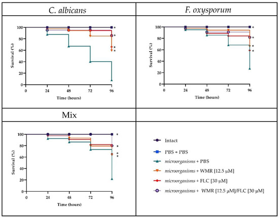 Survival curve of G. mellonella infected with C. albicans, F. oxysporum, and the mix of the two pathogens, treated with WMR and FLC and their combination. * indicates significant difference (p < 0.05, Tukey’s test).