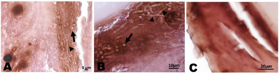 Candida and Fusarium presence alone or together within G. mellonella tissues was assessed via collecting larvae, injected with the pathogens, as described above, from each group on day 3 post-infection and treatment. For histology, the infected and control larvae were processed with histological protocols for optical microscopy. Briefly, the samples were fixed with 10% neutral formalin; then, they were dehydrated with an ethanol gradient (70, 80, 90, 96, and 100% ethanol) and embedded in paraffin. Hematoxylin–eosin staining was performed on sections of 10 µm [30]. The images were acquired with a Zeiss Axiocam Microscope Camera Applied to a Zeiss Axioscope microscope (Zeiss, Jena, Germany).