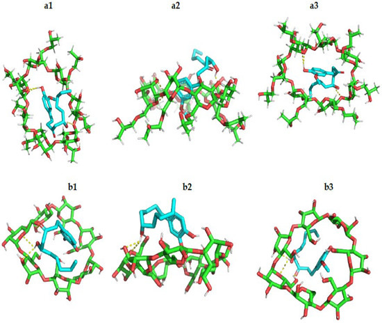 Three-dimensional molecular model stick representation of 6-G interaction within the cavities of (a1) HPβCD from top view, (a2) HPβCD from side view, (a3) HPβCD from basal view, (b1) βCD from top view, (b2) βCD from side view, (b3) βCD from basal view.