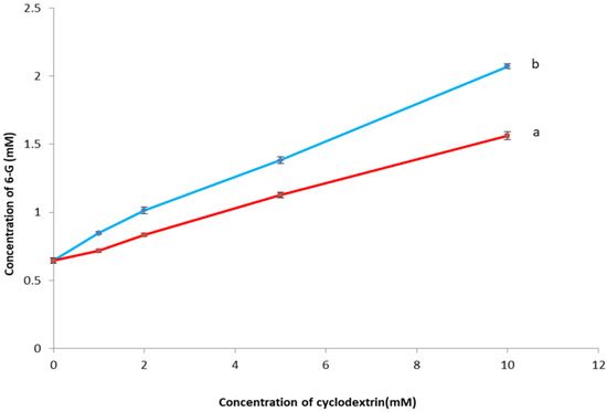 6-G exhibited higher solubility in the case of HPβCD than βCD. Additionally, the apparent stability constant (Ks) of βCD and HPβCD complexes was 153.24 ± 2.16 and 248.05 ± 4.78 M−1, respectively. The complexation efficiency (CE) was 0.102 ± 0.024 and 0.161 ± 0.031, respectively. The sufficiently higher stability constant and complexation efficiency values demonstrated the development of a more stable inclusion complex between 6-G and HPβCD than β-CD.