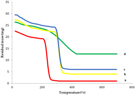 Thermogravimetric analysis of (a) 6-G, (b) HPβCD, (c) physical mixture, (d) 6-G/HPβCD complex. Abbreviation: TGA, thermogravimetric analysis; 6-G, 6-gingerol; βCD, beta cyclodextrin; HPβCD, hydroxy propyl beta cyclodextrin.