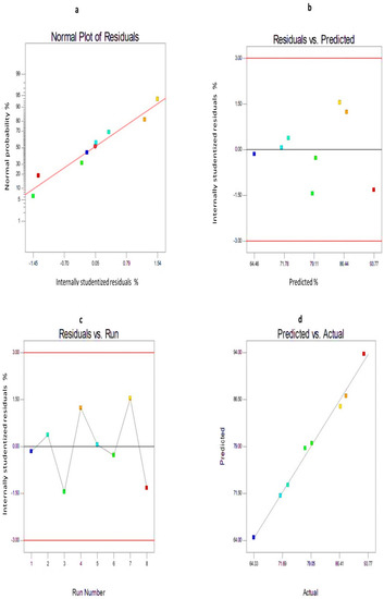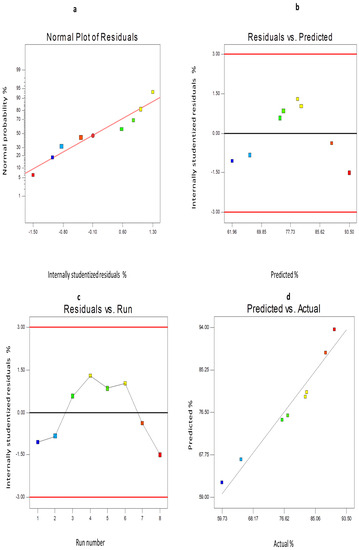 Furthermore, the diagnostic plots of both EE% and Q24h were developed to assess the reliability and the reasonable fit of the present model (Figure 6 and Figure 7). The difference between the actual values of each response and their corresponding predicted values was used to determine the residuals (Y1 and Y2). Figure 6a and Figure 7a show the normal probability plots of the residuals as a linear pattern with a normal distribution of residuals, implying that the obtained data need no transformation. The colored points, demonstrating the values of both responses, were randomly distributed and presented around the zero axis (Figure 6b and Figure 7b), indicating the lack of constant error. Figure 6c and Figure 7c depict a uniform scattering of points, demonstrating the absence of lurking variables. The significance of the influence of the studied independent variables on Y1 and Y2 was demonstrated by the ANOVA analysis, as shown in Table 3.