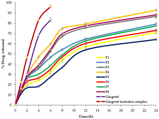The Q24h of different 6-G-loaded ENs ranged from 64.33 ± 1.29 to 92.74 ± 1.54%, according to Figure 8. 6-G/HPβCD complex showed significantly higher drug release than 6-G. This could be explained on the basis of increasing the solubility of 6-G after inclusion in the HPβCD complex [20]. The release of 6-G from various ethoniosomal formulations was clearly more sustained than that of both 6-G and 6-G/HPβCD complex, which showed 60.03 ± 1.75% and 90.15 ± 1.42% drug released after 6 h, respectively. These findings suggested that the developed ethoniosomal formulations act as efficient reservoirs for 6-G, allowing it to be released in vitro for an extended period of time. Furthermore, the increased in vitro release of free 6-G and 6-G/HPβCD complex showed that the semipermeable cellulose membrane had no effect on the release of 6-G and that the sink conditions were successfully achieved [35]. These results agreed with Wei et al. [26] who reported that 6-G-loaded nanostructured lipid carriers demonstrated a more sustained release than free 6-G.