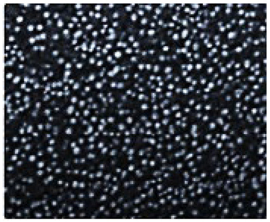 The SEM micrograph (Figure 9) describes the morphological characters of the 6-G-loaded CD-TENs (F8) as discrete and spherical nanovesicles. The spherical morphology of 6-G-loaded CD-TENs could be explained on the basis of the amphiphilic nature of Span 60 [39]. Accordingly, within the aqueous medium, a closed ethoniosomal bilayer would be formed that tends to minimize their surface free energy by the development of spherical transethoniosomal vesicles [14,40].