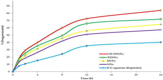 The higher permeability of 6-G-loaded CD-TENs could be interpreted on the basis of the ultra-deformability of CD-TENs due to the presence of both ethanol and the EAs, which improved the deformability, and hence, permeability of the CD-TENs across various biological membranes by squeezing without rupture [16,44]. Additionally, improving the solubility of 6-G after inclusion within the HPβCD complex resulted in higher % 6-G permeated [32].