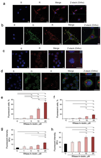 HeLa and B16 cells were seeded in complete DMEM on glass cover slips in 24-well plates at densities of 0.4 × 104 and 0.8 × 104 cells/well, respectively, and incubated under standard conditions overnight. The culture medium was replaced with a serum- and antibiotic-free DMEM medium supplemented with 20 µM of RNase A–biotin conjugate, and the cells were incubated under standard conditions for 4 h. Cells were prepared for antibody staining as described in Section 2.7.