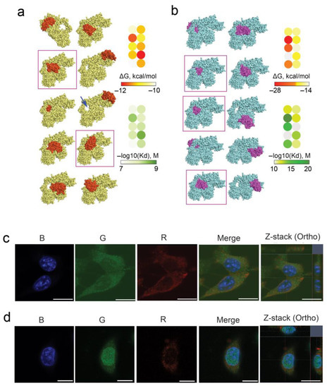 Furthermore, the interaction of RNase A with Ku70/Ku80 heterodimer upon the initial stage of RNase A penetration into B16 and HeLa cells was studied by confocal microscopy (Figure 2c,d). It is seen that Ku70/Ku80 is localized throughout the cytoplasm of B16 cells and in the prenuclear space (Figure 2c, G panel). RNase A penetrates B16 cells and accumulates in the cytosol (Figure 2c, R panel), but complexes between Ku70/Ku80 and RNase A in B16 cells were not detected (Figure 2c, Merge and Z-stack panels), probably due to the low RNase A fluorescence signal.