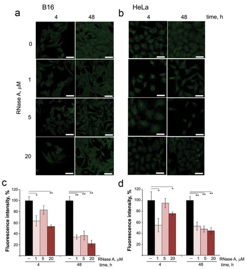 The effect of RNase A on the content of intracellular RNAs in B16 and HeLa cells. (a,b) Images of B16 and HeLa cells, respectively, after incubation for 4 or 48 h in the presence of RNase A (1, 5 and 20 µM). Cells were stained with SYTO RNASelect and analyzed using confocal microscopy. (c,d) The fluorescence intensity of intracellular RNAs in B16 and HeLa cells, respectively, evaluated using ImageJ software. Data are presented as mean ± S.E.M. Statistical processing of the data was carried out using Student’s t-test; * p < 0.05, ** p < 0.01. Scale bars: 10 µm.