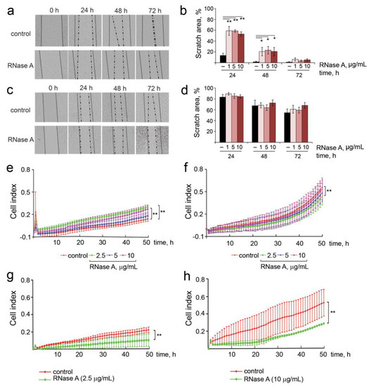 Migration and invasion of B16 and HeLa cells incubated in the presence of RNase A. (a,c) Scratch healing assay for B16 and HeLa cells, respectively. RNase A concentration was 10 µg/mL. Incubation time is shown at the top (4× magnification). Dotted line shows initial edge of the scratch and dash-and-dot line shows boundary of the monolayer 24, 48 and 72 h after scratching. (b,d) Quantification of the data of scratch healing assay for B16 and HeLa cells, respectively. (e,f) FBS-induced trans-well penetration (motility) of B16 and HeLa cells exposed to RNase A (2.5, 5 and 10 µg/mL) for 48 h, respectively. (g,h) FBS-induced trans-well Matrigel barrier penetration (invasion) of B16 and HeLa cells exposed to RNase A at concentrations of 2.5 and 10 μg/mL, respectively. Cell motility and the rate of invasion were monitored using the xCELLigence system. Data are presented as mean ± S.E.M. Data were statistically processed using Student’s t-test; * p < 0.05, ** p < 0.01.
